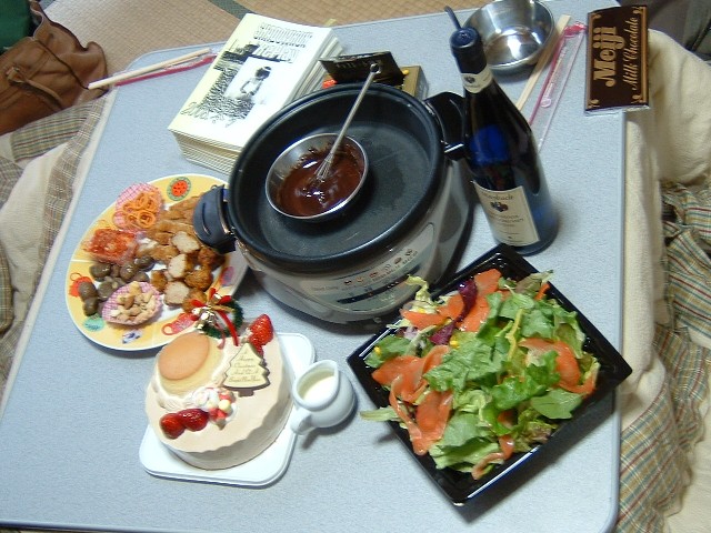 今回製本作業にかこつけて、面子の一人がやってみたがったチャレンジメニューがハムカツチョコフォンデュ。