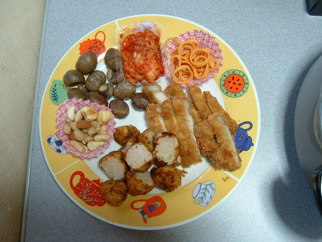 カツは油っぽいだけで味が完全にチョコに負けてイマイチ。スパイスと塩気が効いてる分唐揚げはそれなりの味。キムチ・ハバネロスナックあたりはチョコカキピーなノリでまあまあ。ナッツと甘栗は普通に美味。