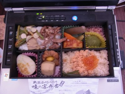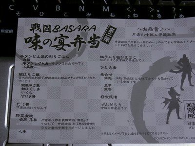 ご飯2種類とおかず。はらこ飯と牛タンのしぐれ煮、ずんだ餅、と仙台名物意識してるのはいいとして、「伊達政宗にちなんで伊達巻」には悪いけど笑ったよw