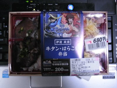 夕方割引で300円引きお手ごろ価格の政宗様。牛タンとハラコ飯でどっちもご飯みっしりなのですごいお腹いっぱいになる。ちなみにはらこ飯はご飯がふつうの白米、牛タンの方は麦混ざりのご飯でした。こだわり? ラベルに映画の割引券もついていてなかなかお得w