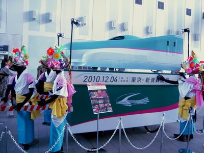 エントランスに入ると、まずは足元に機関車のプレートの群がお出迎え。それとこないだ開通した青森新幹線のおめでとうディスプレイが!