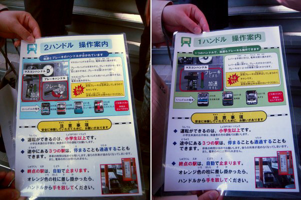 ミニ列車は3人乗りで1台200円。レールは一周300M。ちゃんと駅やら信号もあってブレーキ操作も要求されます。しかも車両タイプが2ハンドル・1ハンドルの2種類あって、並んでる時間に使い方を学んでおかねばならないのですよ。お金を払うところで使い方シートを貸してくれるんだけど、電車乗るときには回収されるというw; 見ながら運転はできないのでした~。焦った!
