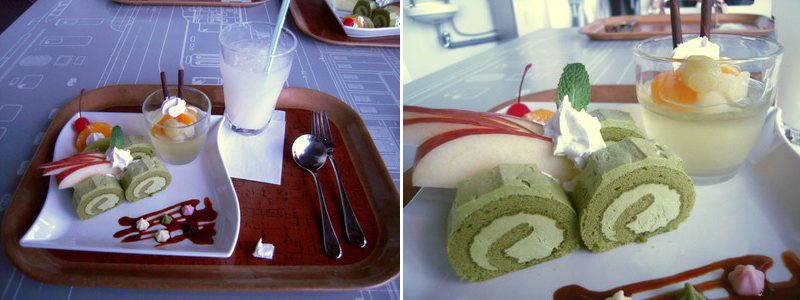 お次は建物の中に入って…スイーツを食べに移動w ハヤブサスイーツ限定10食とか言われたら食べてみたくなるのが人情と言うものでw 3人分まだありますよということでうきうきして頼んでみました。抹茶のロールケーキをメインにチョコレートとフルーツの盛り合わせとドリンクバー付いて、割とよいボリュームでした。ここのカフェはテーブルの天板の模様が新幹線の設計図だったりしてさすが。
