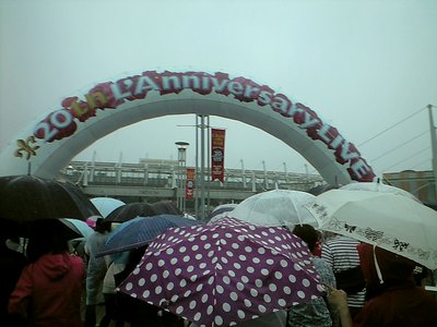 なんだか訳あってチケットふつうに郵送できないから、待ち合わせていこうということになったものの、待ち合わせまで時間あるからちょっと美容院で髪トリートメントしてもらって、隣の駅前でちょっと買い物して…とかやってたら見事にすれ違いを重ねて待ち合わせに手間取ったりしつつ、お茶の水あたりで無事に合流して一路西へ。このあたりだと既に雨も収まりつつあって、「これならライブ結構楽かもねー」などと言っていたらとんでもない。現地の飛田給はもう本格的に土砂降り。そして道路の水はけもあまりよろしくないと見えてあちこちに深さ2~4cm程度の水溜まりができてて、そこを傘差した集団が続々と歩くもんだから逃げ場ナッシン。…み、道に迷わなくて済むけどね(無理矢理よかった探し)。