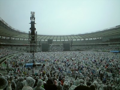 電車の中でチケットあらかじめもらっていたので良かったけど、もぎり後の混雑でまんまとはぐれ、とりあえず席へ。席にいったら18列目でとりあえず端っこで風向きによっては吹き込んでくる状態ながら屋根のかかっている席。常時合羽着込まなくても良さそうなのでちょっとほっとする。私らの席より3~4列前くらいはもう屋根無くて白いビニール包みな人々多数。もちろんアリーナはみんなビニール包み。白だけじゃなくて時々カラーの人もいて、なんか面白い眺めでしたw