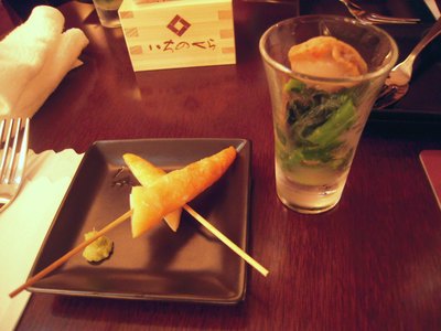完全予約制のお値段4500ぽっきりの企画なので、先にお会計で、座席もあらかじめ割り振られてて、私らの席はホール奥の五橋のお部屋前のテーブル。しかし二人で丸テーブル一個は結構狭い。グラスだけならともかくお料理のお皿と取り皿置くのはわりとパズルw