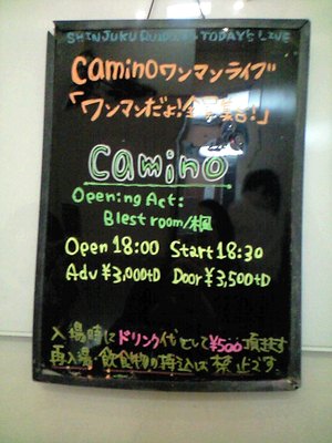 4人組が引っ込んで、割とすぐ始まるのかと思ったらその後もステージ準備や何やで30分くらい? 結局caminoの皆さん出てきたの20:00頃でした。…ありえん。どういう大人の事情でこんなんなのかは知りませんが、ワンマンライブ言っててこれはないわー。前座なんかせいぜい30分までにしといて欲しい…。あるいは最初から20:00開演てしとくとかさ!