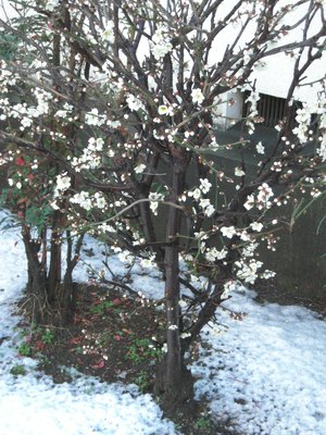 せっかく咲いた梅の花がちょっと可哀想なことになってしまっていましたが、夜にはこの辺の雪もとけてるかな。